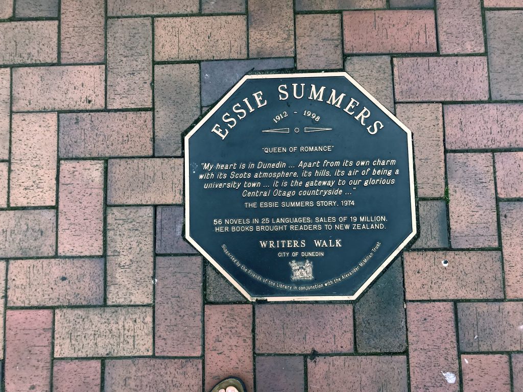 She tells me that Sweet are the Ways is also her own favourite, and how New Zealand Inheritance nearly didn’t get accepted because it was too much mystery written in with the romance, but how a Christmas card from Alan Boon and encouraging feedback from Essie’s husband Bill led to a rewrite and publication. We talk about how Essie would have been simply thrilled by her Dunedin Writers’ Walk plaque at the top of the Octagon, though she was humble. She turned down an MBE for services to tourism (move over, Lord of the Rings) because it wasn’t her kind of thing. Liz tells me of the Invercargill-based Essie Summers Fan Club, who banded together to lobby for Essie to get that award. And about Ken Pierce.