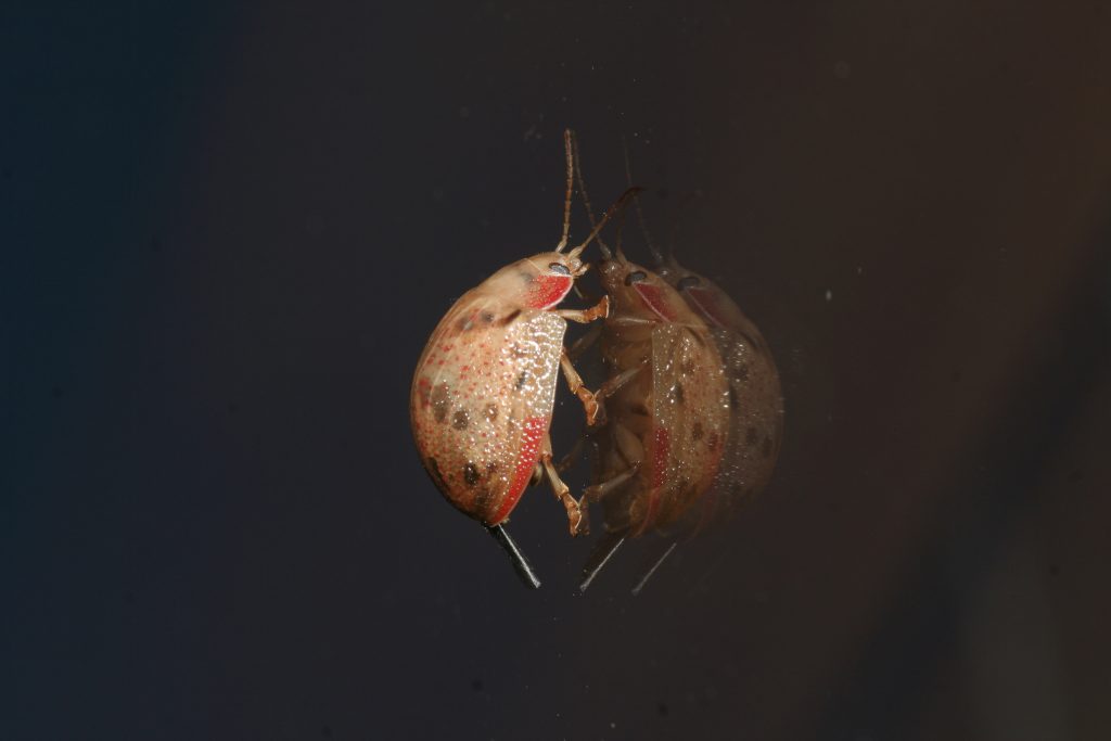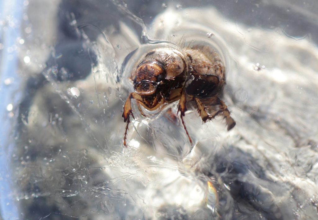 A beetle encased in ice was first trapped by water set out for wildlife: falling into it, held by the power of surface tension, then fatally by the clear envelope of ice that grew around it, it seems to be climbing through a transparency that it can’t overcome.