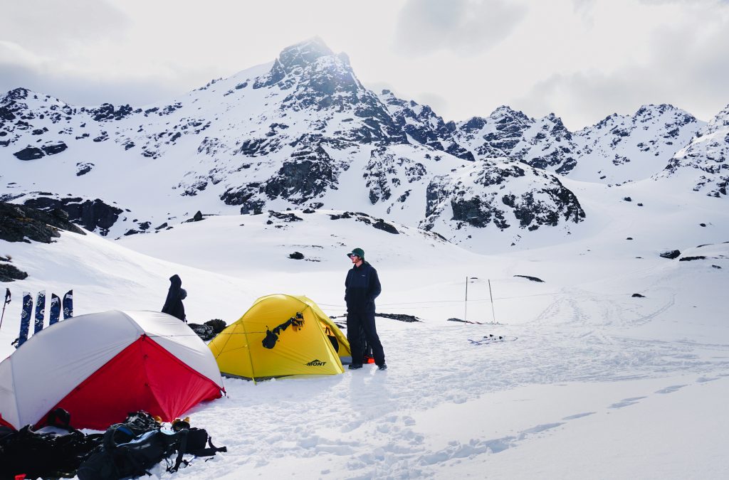 The group’s expedition to Lake Hope is the main focus of Close to Home. They planned to spend six days at the picturesque lake, the biggest in The Remarkables mountain range. The route in, via the South Branch of Wye Creek and Skingut Pass, features lush forests, cascading waterfalls, as well as spectacular views of the Whakatipu Basin and the backside of The Remarks. There’s also the nearby Two Mile Hut, a historic stone musterer’s hut built by the boundary keeper for Kawarau Falls Run more than a hundred years ago. Half of the crew hiked in while the others had to heli up with their equipment, a sometimes-necessary evil – it’s just not always possible for the crew to cart all the gear in themselves. Ryan alone needs to bring a laptop, hard drive and power so he can work in the downtime, sorting footage and editing. Still, better than racking up emissions on a long-haul flight.