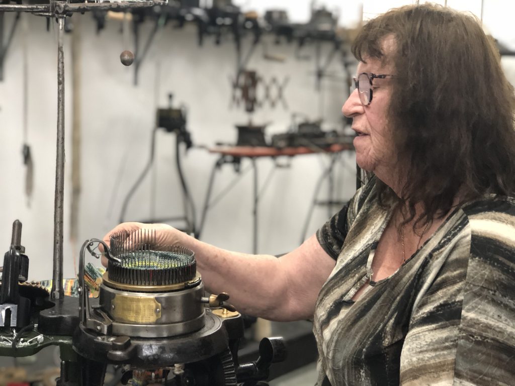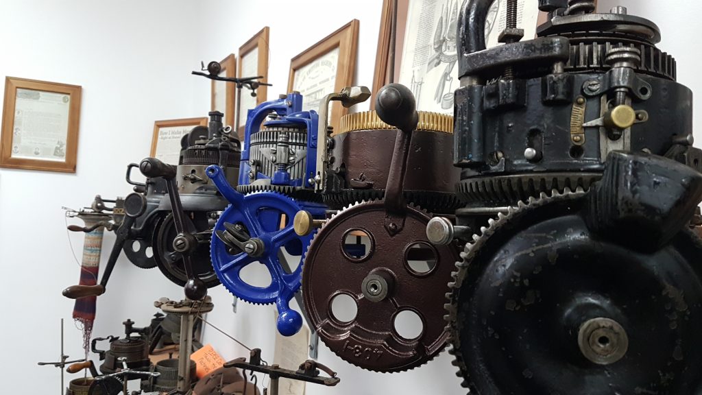 On a screen that towers over this mysterious museum of Circular Sock Machines (which we’ll call CSMs) is Jacqui herself, giving instructions on how to use them. By all measures, she is a sock machine guru, though she’s not into flattery. At the very least, she is a highly-esteemed cranker, and much loved in the sock knitting world. As well as collecting and restoring CSMs, the oldest of which is 120 years old, Jacquie actually builds them.